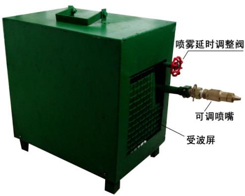 本裝置設計為一體化,有進水閥門、噴霧時間調(diào)整閥門等組成,當迎頭放炮時震動沖擊波沖擊機械放炮噴霧裝置的受波屏,進水閥門打開,開始噴霧,同時水源又給進水延時水箱注水,由于延時水箱與所配墜鐵比重偏移,水箱的水滿后,水箱逐漸傾斜并緩慢放水,從而逐漸減少噴霧延時時間,水箱的水流盡后,噴霧停止,直至下一次放炮,再次循環(huán)實現(xiàn)噴霧過程。噴霧延時水箱有進水調(diào)整閥門,調(diào)整此閥門可調(diào)整噴霧時間。