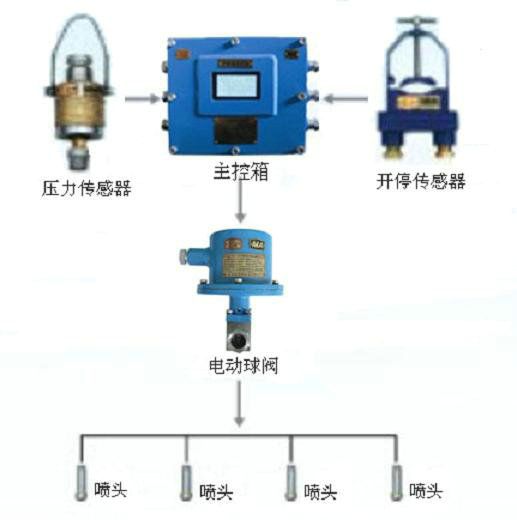 只有水壓傳感器檢測到采煤機(jī)水采水路中有一定的水壓(或工作燈開啟)時,才能允許啟動采煤機(jī)。采煤機(jī)開動后,開停傳感器(或光控傳感器)將信號送入主控箱,主控箱控制電動球閥開啟,實(shí)現(xiàn)對產(chǎn)塵點(diǎn)進(jìn)行噴霧降塵。采煤機(jī)停機(jī)(或采煤機(jī)工作燈關(guān)閉)后,主控箱控制電動球閥延時一定的時間后關(guān)閉,停止噴霧降塵。